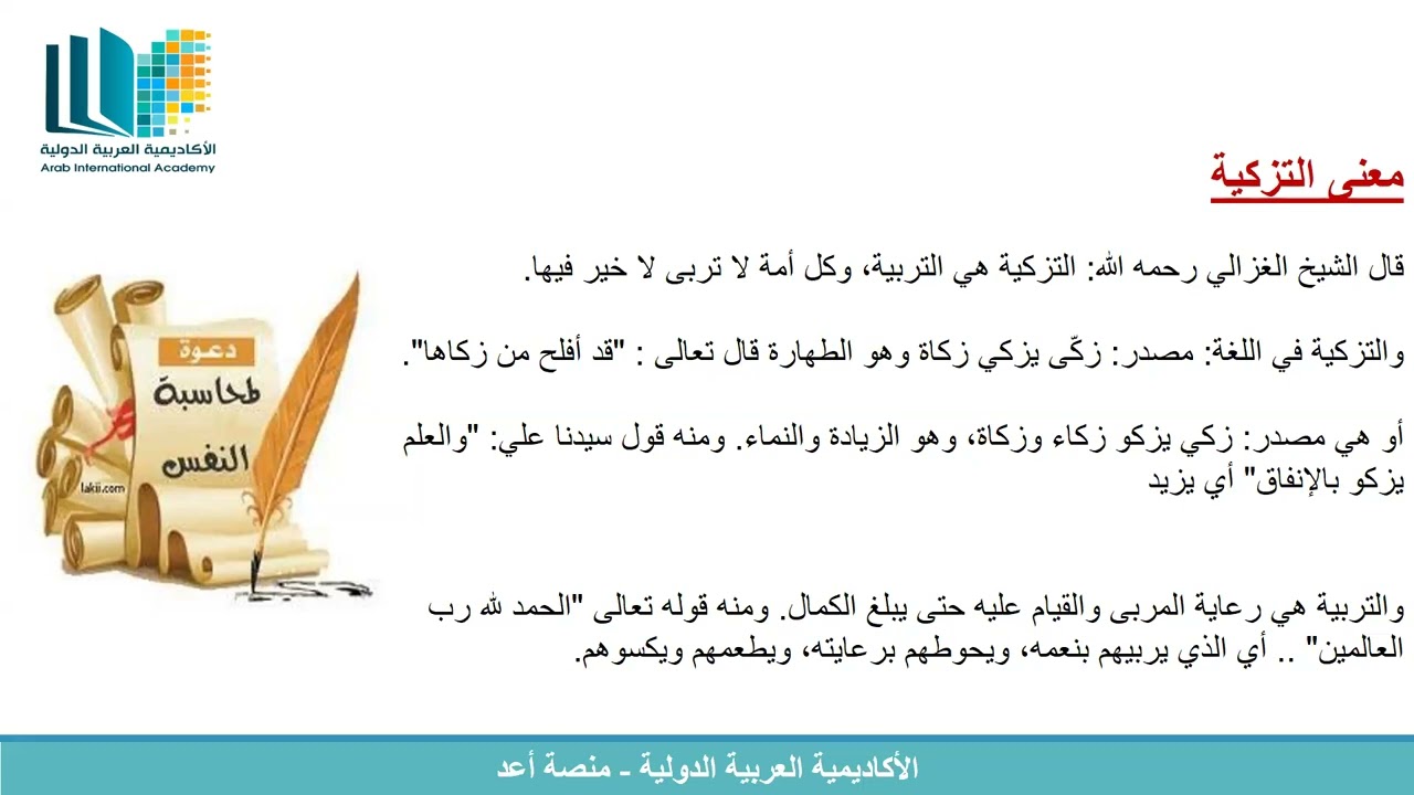 معنى التزكية: بأنها التربية، والطهارة، والنماء، ورعاية النفس حتى تبلغ الكمال.